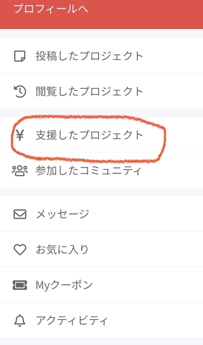 CAMPFIREログイン後、右上のアイコンをタップし、「支援したプロジェクト」の手順で表示可能です。